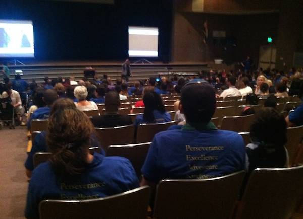Also, current and prospective Rocky Mountain Prep parents and students showed up en masse to the last community meeting in t-shirts emblazoned with the charter’s logo.