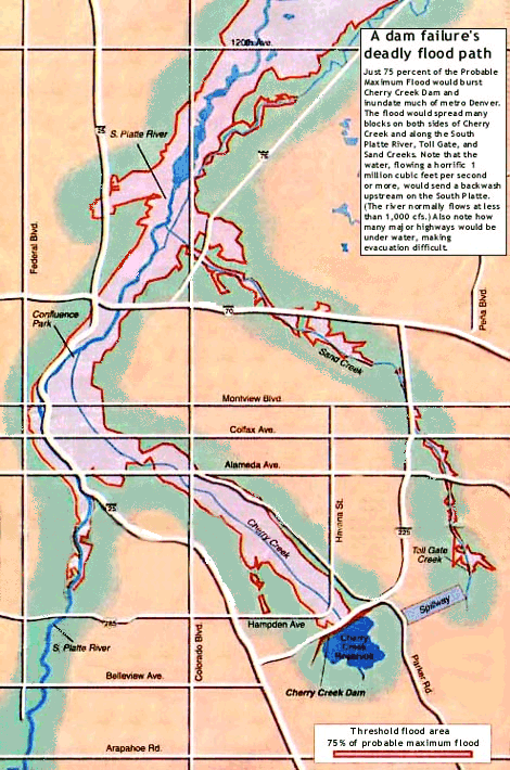 Since 1988, studies disturbingly have shown that the Cherry Creek Dam would break during a PMP storm, or even rainfall approaching the PMP’s severity. The failure would cause the Probable Maximum Flood, whose consequences were described earlier.